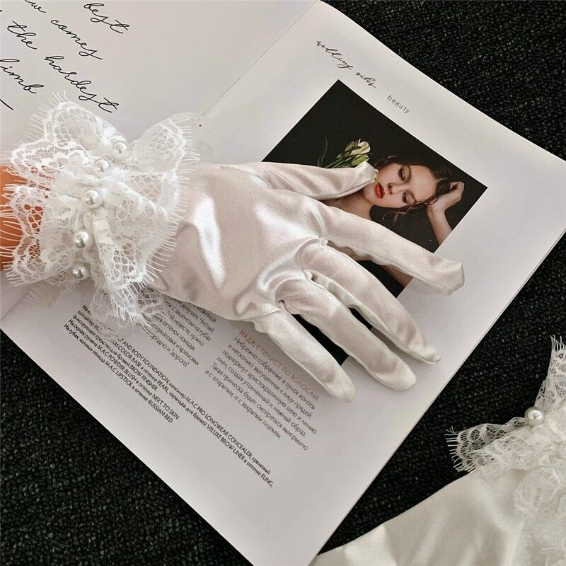 色:白いレースの花のサテンビーズの手袋